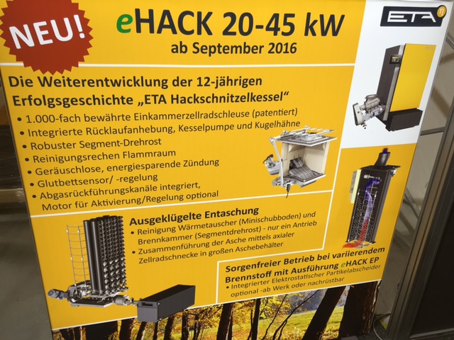 Avec une refonte complète du modèle de la chaudière ETA HACK mixte bois déchiqueté, pellets, miscanthus et lin. Le rendement monte à 95%. Intégration d’origine d’un filtre électromagnétique qui supprime plus de 80% des poussières et particules dans les fumées. Nouveau brûleur rotatif autonettoyant. Nouveau brevet ETA sur l’extraction des cendre avec une seule vis étanche à l’air. La « EHack » intègre aussi d’origine la pompe de charge du ballon tampon avec recyclage motorisé, ainsi que le recyclage des fumées pour pouvoir brûler du combustible très sec tel que le pellets, les déchets d’ébénisterie, le lin et le miscanthus.
