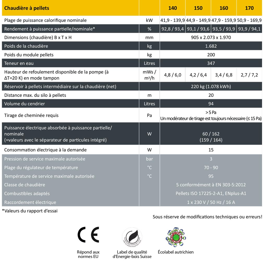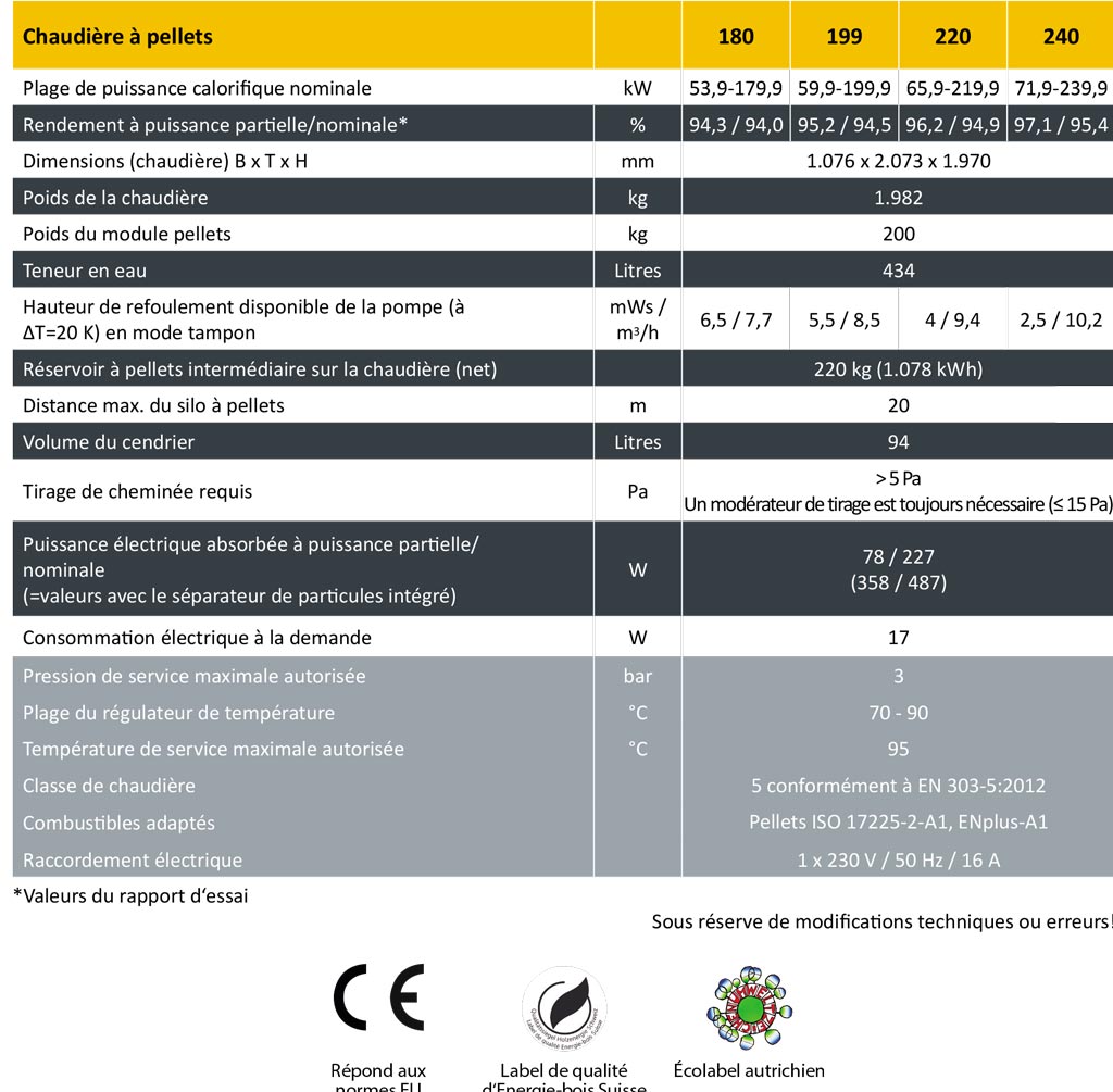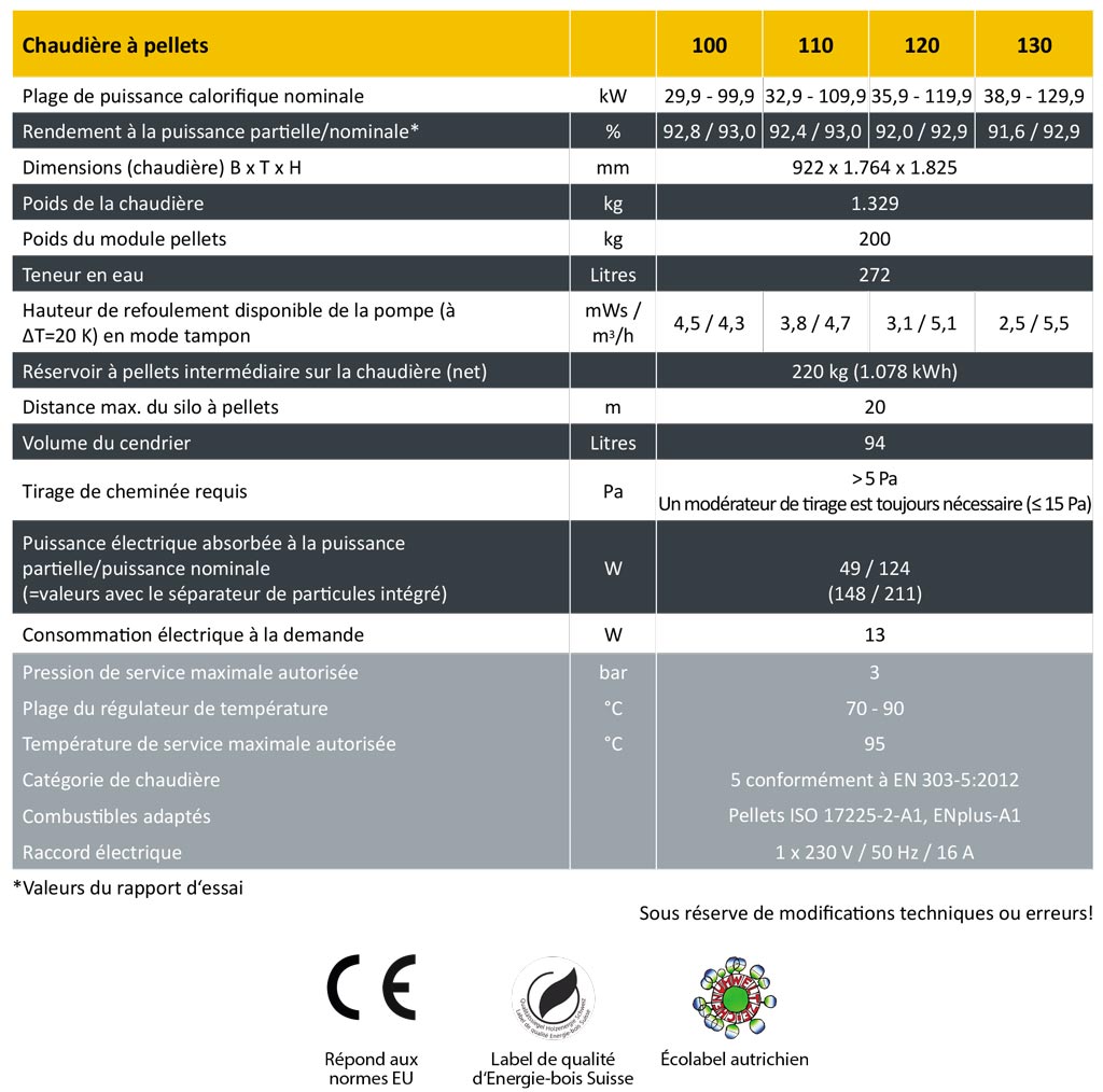 La consommation totale de pellets par an en tonnes se calcule en divisant par 3 la charge calorifique en kilowatt. Pour l’encombrement des pellets en mètres cubes, on divise la charge calorifique par 2. Par exemple, pour une charge thermique de 90 kW, il faut 45 m3 ou environ 30 tonnes de pellets par an. En passant au chauffage avec des pellets, on peut aussi utiliser comme base de calcul la consommation de l’autre combustible.