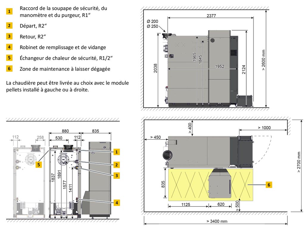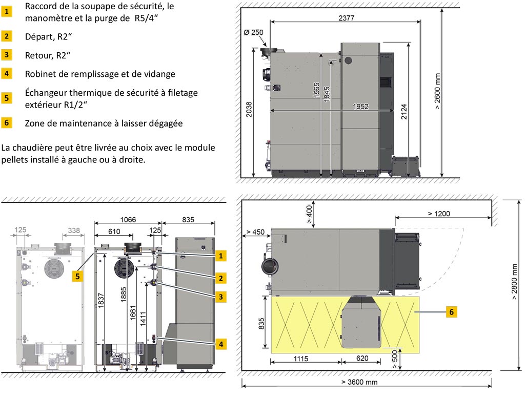 La chaudière peut être livrée au choix avec le module pellets installé à gauche ou à droite.