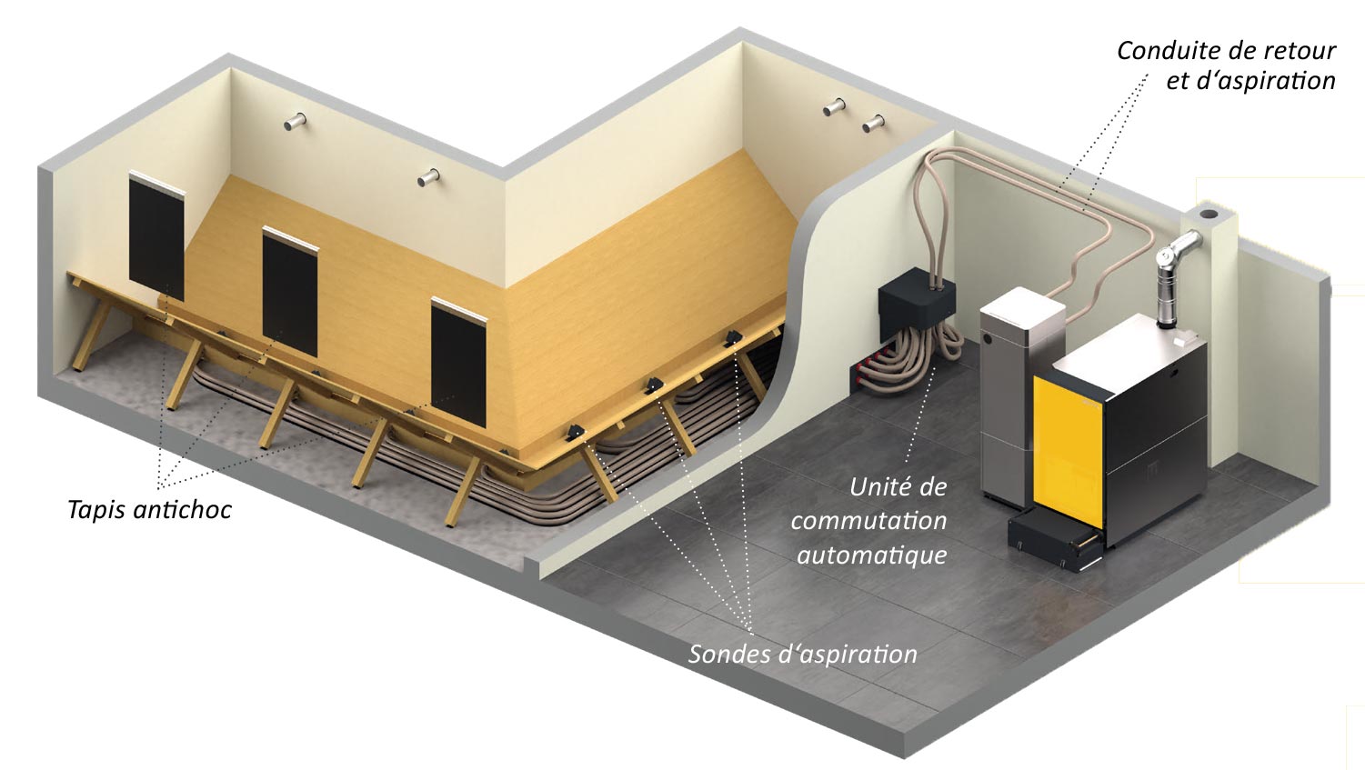 Les parois inclinées permettent aux granulés d’être toujours orientés vers la vis d‘extraction. Le tapis antichoc est suspendu en face des tubes de remplissage pour éviter l’impact des granulés contre la paroi lorsqu’ils sont injectés dans le silo par le camion. Il faut veiller à positionner les raccords de remplissage sur la face correspondant au prolongement de la vis d‘extraction, afin d‘assurer un remplissage optimal et ainsi une extraction performante.