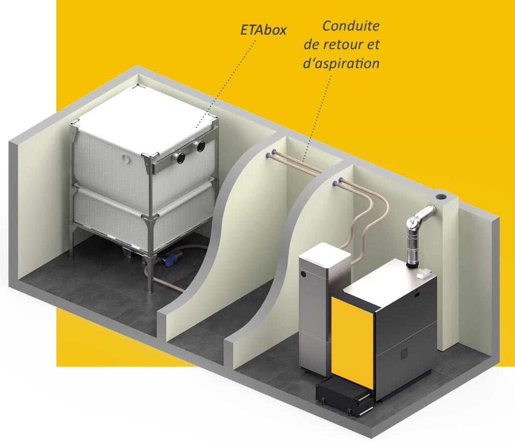 L’ETAbox est une solution particulièrement pratique. Elle peut être installée directement dans la chaufferie, à l’étage, dans une grange ou — sous couvert — à l’extérieur. Elle conserve les pellets au sec même dans des endroits humides. Une distance de 20 m d’aspiration de la box jusqu’à la chaudière ne pose aucun problème. La seule contrainte est que l’ETA Box ne peut se monter accolée à un mur. C’est pourquoi l’encombrement est plus important que pour un silo en maçonnerie pour la même capacité de stockage.