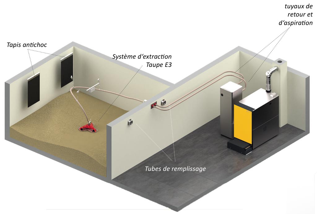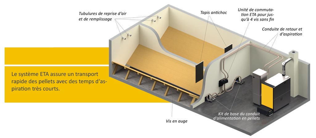 En raison de contraintes de construction, il se peut qu‘avec les systèmes d‘extractions conventionnels ETA, le volume de stockage de Pellets soit trop restreint. Pour cette raison, le système d‘extraction Taupe E3 de haute qualité offre La solution la plus judicieuse