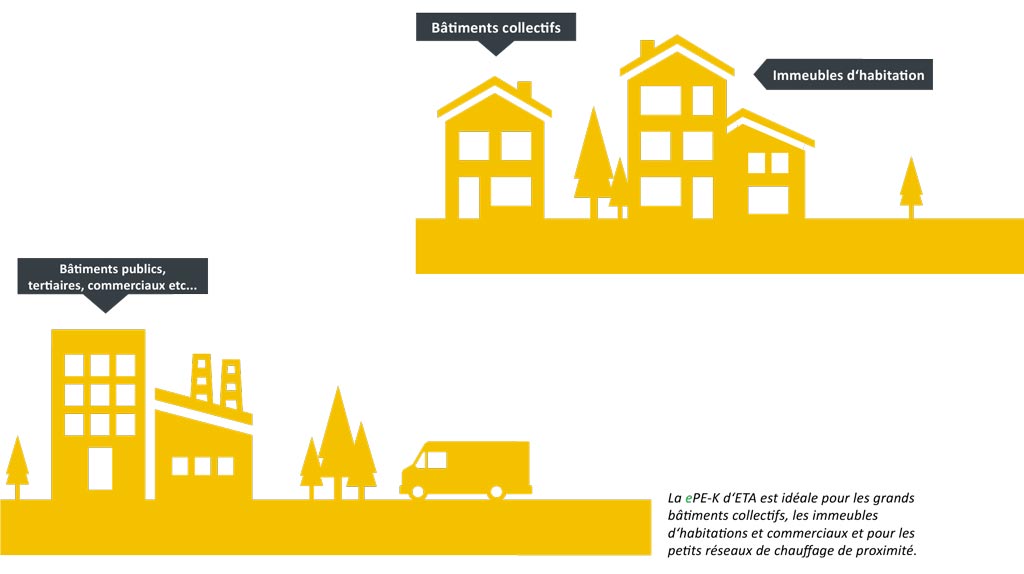 Même si les besoins calorifiques sont très élevés, la ePE-K d‘ETA est à la hauteur du défi. Deux, trois, voir encore plus de chaudières peuvent être montées en parallèle. Cette variante structurelle, nommée construction modulaire ou en cascade, a été perfectionnée par ETA afin de simplifier au maximum l‘intégration dans l‘installation existante et réduire au maximum les dépenses concernant les canalisations, les volumes des ballons tampons, les pompes et le montage.