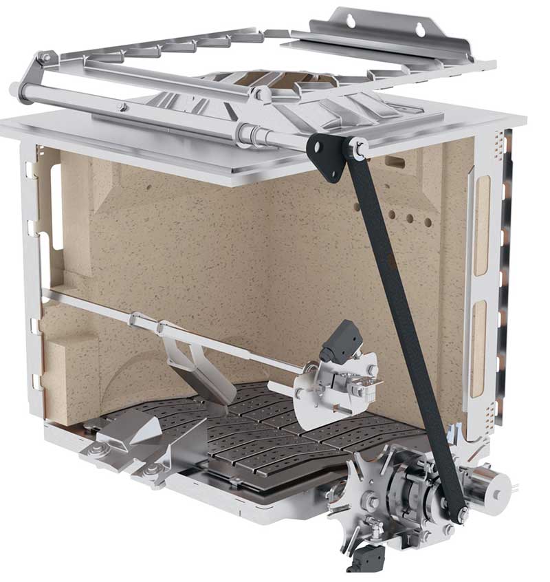 Le combustible de combustible est poussé par le côté sur la grille rotative à segments et brûle de façon contrôlée. La chambre de combustion réfractaire à alimentation d’air ciblée permet une température de combustion élevée et donc un rendement de combustion optimisé du combustible. Lorsque le combustible est intégralement brûlé, la grille rotative à segments pivote complètement à 360°. Les corps étrangers, tels que des clous et/ou des cailloux, tombent alors dans la grande vis d’évacuation des cendres située en dessous. Le râteau breveté au-dessus de la chambre de combustion élimine désormais les cendres du foyer totalement automatiquement, ce qui accroît l’efficacité de la chaudière encore d’avantage et garantit aussi une température des fumées plus faible.