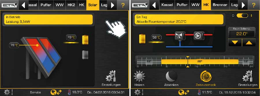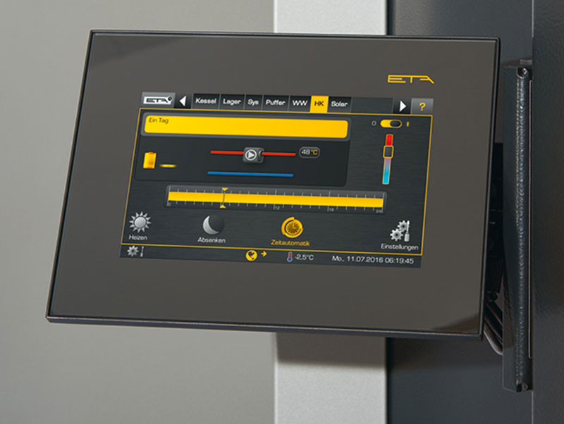L‘époque des boutons et des régulateurs compliqués est révolu, car avec l‘écran tactile du système de régulation ETA, vous effectuez les réglages d‘une manière confortable et en toute simplicité. Les icônes sont explicites. Que vous souhaitiez augmenter ou diminuer la température de chauffage, modifier la période nocturne ou mettre la chaudière en marche réduite pendant les congés, — vous n’avez pas besoin de mode d’emploi pour trouver la bonne icône !