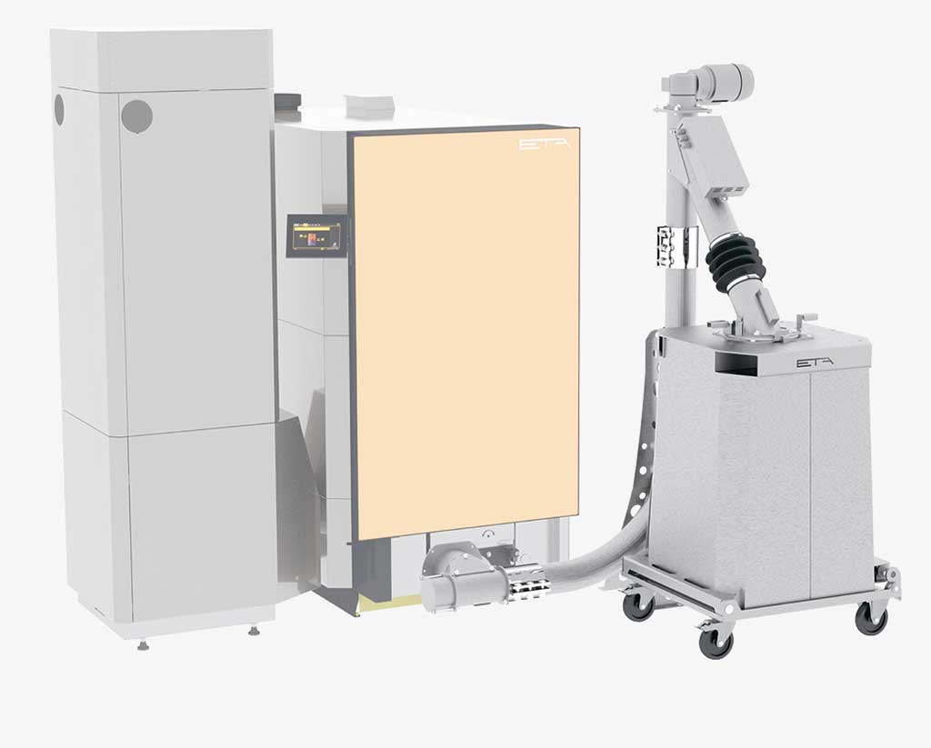 Afin d‘augmenter les intervalles de décendrages , ETA vous propose une extension de décendrage dans des cendriers externes. Cette extension peut-être positionnée à droite, comme à gauche et à l‘avant, comme de côté. Ce système ne permet non seulement une implantation facile, mais prend aussi peu de place, grâce au système spécifique de vis sans fin sans axe.