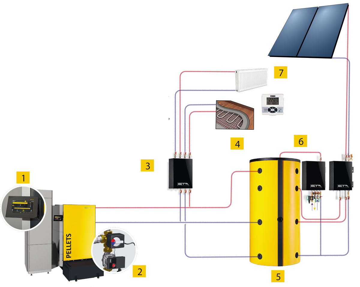 Toutes les fonctions pour les deux circuits de chauffage, la préparation ECS (accumulateur ou échangeur ECS) et l‘installation solaire sont déjà présentes dans la régulation ETAtouch, et ce sans supplément. Toutes les chaudières ETA sont équipées en série d‘une connexion Ethernet. Si vous connectez la chaudière pellet à Internet, vous pouvez piloter tous les composants depuis votre PC, votre tablette ou votre Smartphone.