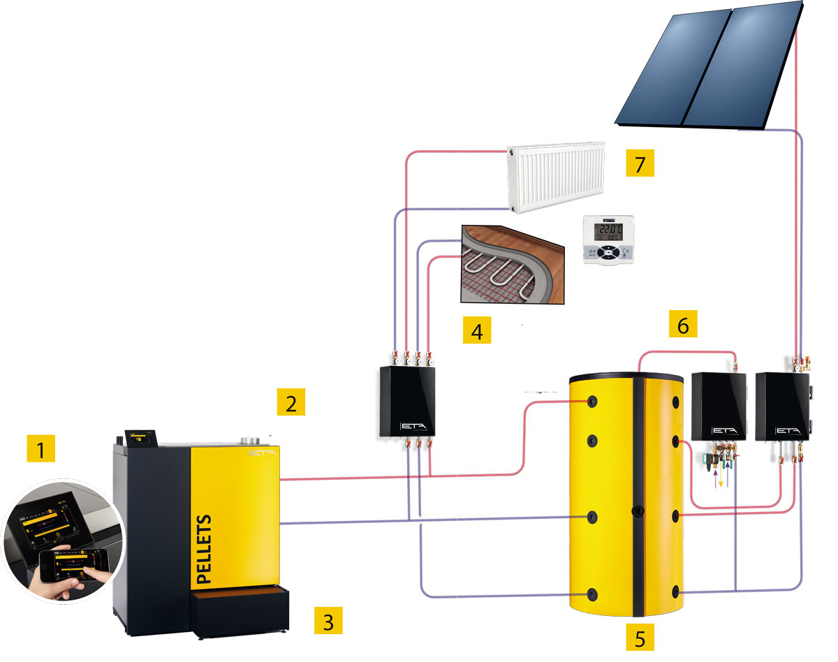 Toutes les fonctions pour les deux circuits de chauffage, la préparation ECS (accumulateur ou échangeur ECS) et l‘installation solaire sont déjà présentes dans la régulation ETAtouch, et ce sans supplément. Toutes les chaudières ETA sont équipées en série d‘une connexion Ethernet. Si vous connectez la chaudière pellet à Internet, vous pouvez piloter tous les composants depuis votre PC, votre tablette ou votre Smartphone.