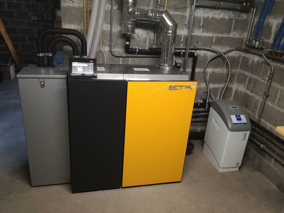 Chaudière ETA Pellets Unit 15 kW avec ballon tampon combiné de 500 litres pour optimiser le fonctionnement de la chaudière et produire l’eau chaude sanitaire en instantané avec un échangeur en inox intégrer.