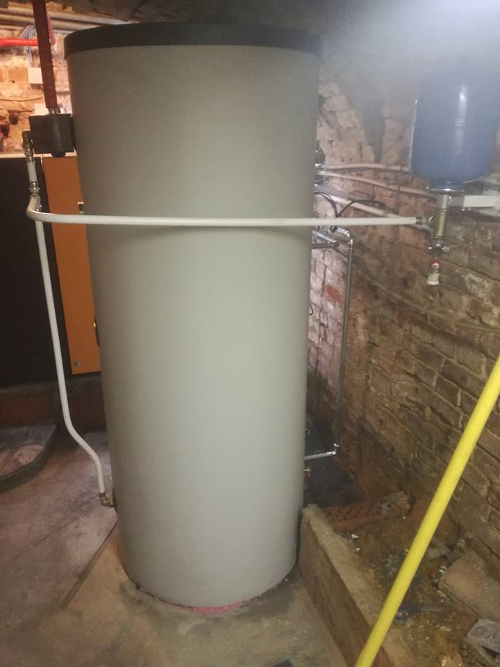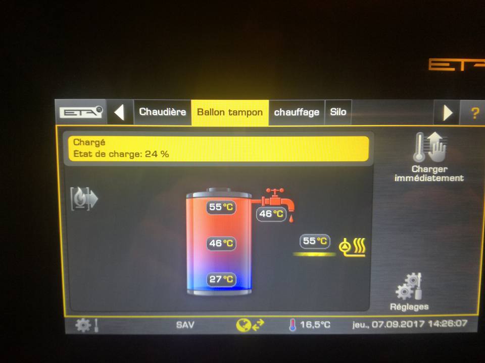 Ici, chaudière à pellets ETA Pellets Unit 15 kW, ballon tampon combiné 400 litres avec échangeur inox pour production d’ECS en instantané, tubage de cheminée en inox qualité 904. Régulation climatique. Gestion par Internet avec une bonne régulation.
